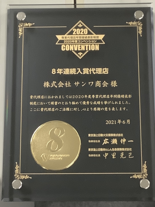 東京海上日動火災保険(株)2020年専属代理店年間優秀表彰を8年連続で受賞致しました。